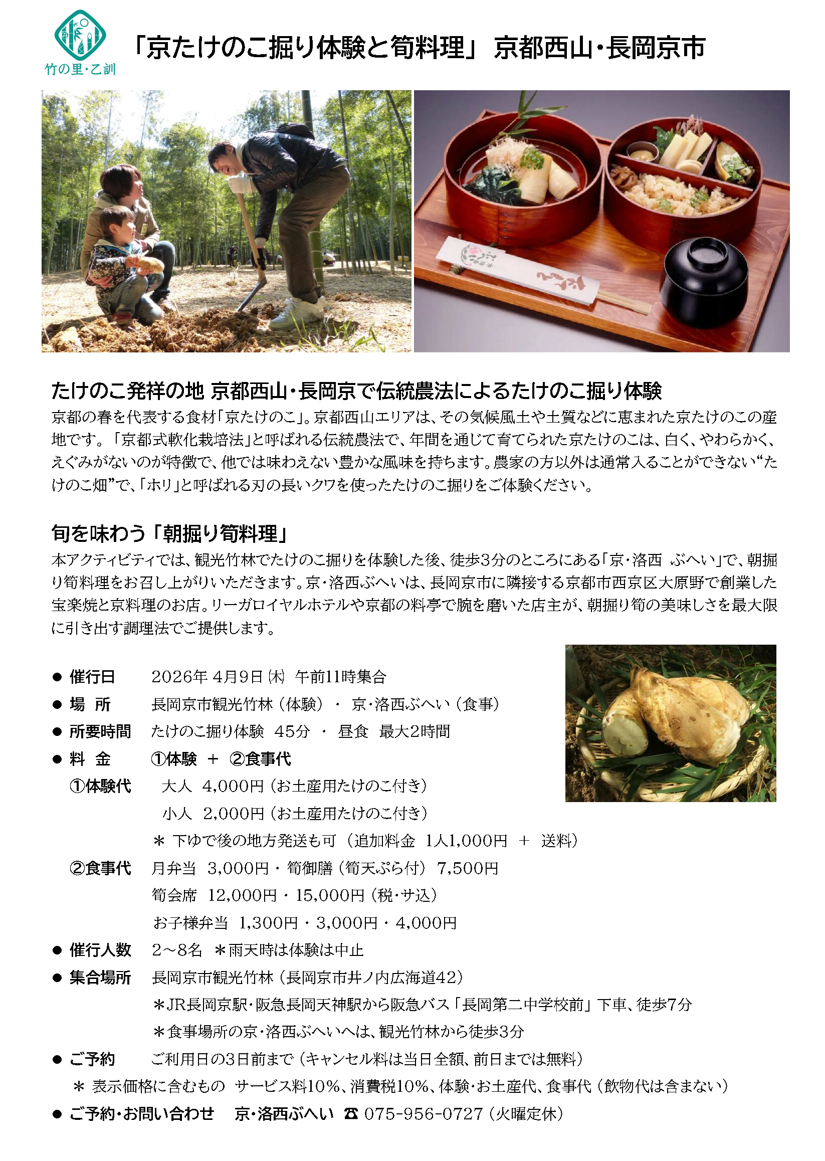 観光協会の竹林でたけのこ掘り体験を楽しんだ後、たけのこ料理のお店「京・洛西ぶへい」で旬のたけのこ料理を味わえる豪華なプランです。皆様ぜひともご参加ください。 PDFはこちら