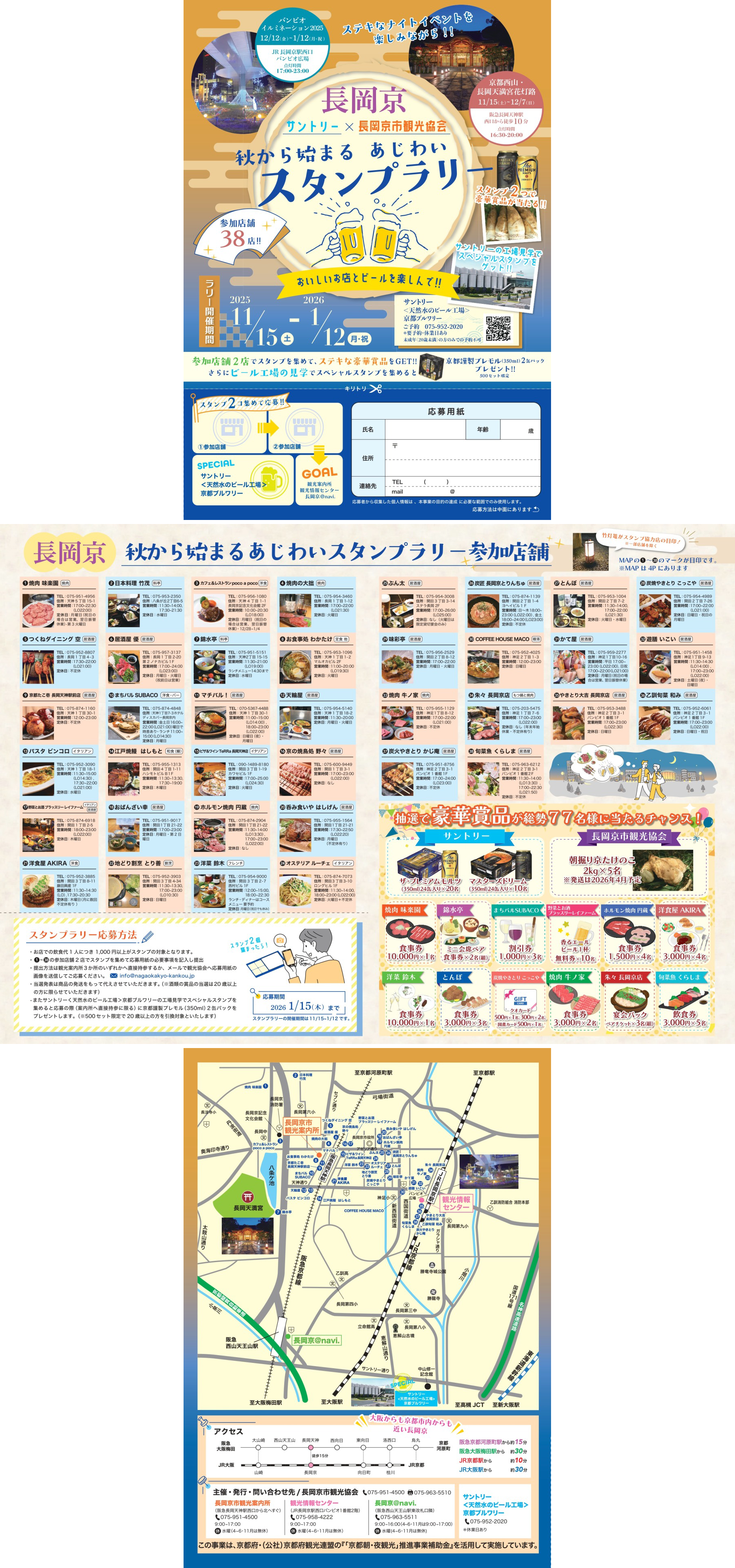 | 内 容 | ●対象店舗(市内38店舗)2店で飲食をしてスタンプ2個を集めます。 ●スタンプを集めた台紙を観光案内所へ提出すると、豪華賞品への応募ができます (提出方法は観光案内所へ直接持参またはメールにて)。 ●サントリー京都ビール工場をスペシャルスポットとして設定し、ビール工場の工場見学をすると「SPECIALスタンプ」を押印。2ヶ所のラリースタンプとSPECIALスタンプを集めて観光案内所へ持参してもらうと、豪華賞品への応募に加えて、その場で景品 (京都謹製プレモル350㎖2缶パック)をプレゼントします。 |