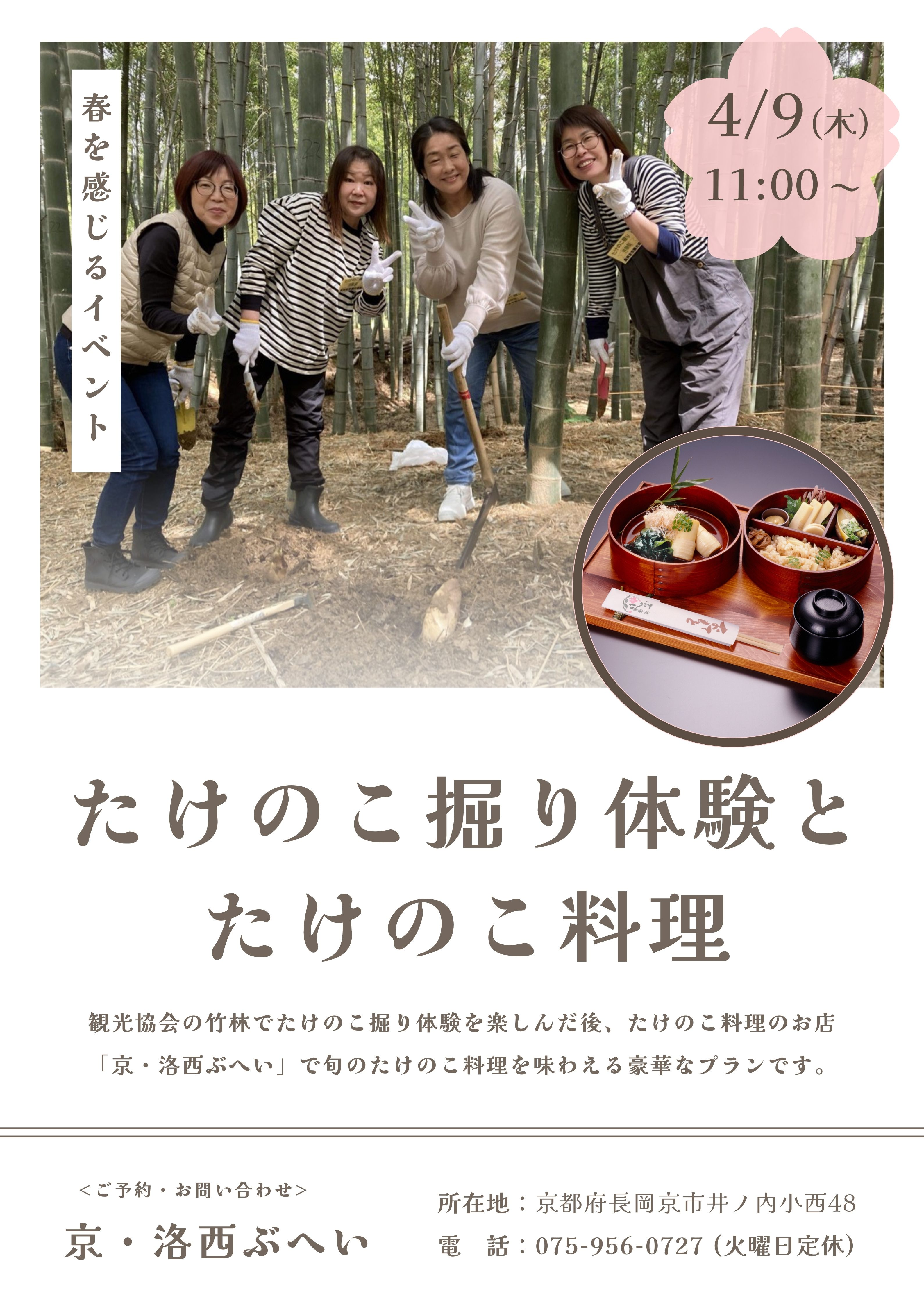 観光協会の竹林でたけのこ掘り体験を楽しんだ後、たけのこ料理のお店「京・洛西ぶへい」で旬のたけのこ料理を味わえる豪華なプランです。皆様ぜひともご参加ください。 PDFはこちら